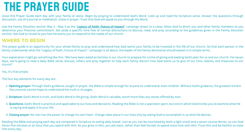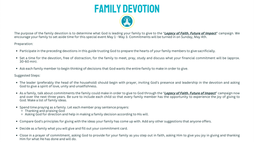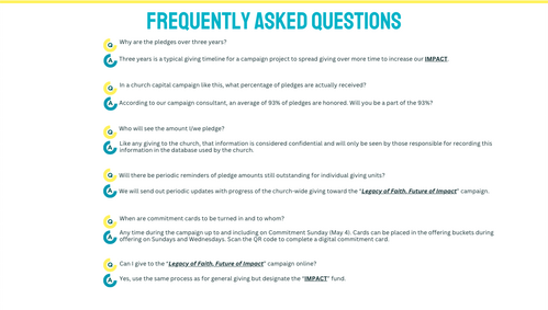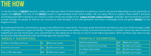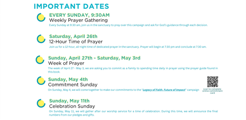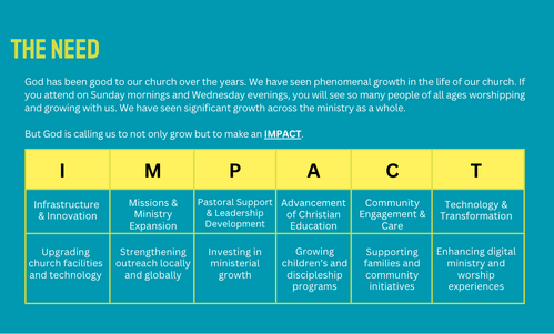 The program has a great title, “Legacy of Faith, Future of Impact”. This title challenges us to do the extraordinary, to give "over and above," sacrificially for the next 156 weeks. The title reminds us that we can all make a significant difference as we allow our giving to bless future generations for the Kingdom of God.