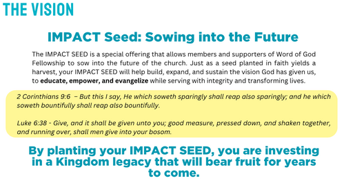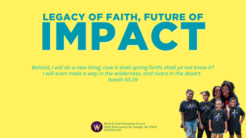 I earnestly believe that we the people of Word of God Fellowship Church are ready for the great challenge which the “Legacy of Faith, Future of Impact” campaign offers. Let us each enter into this exciting effort prayerfully and enthusiastically.