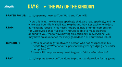This program provides all of us with a wonderful opportunity. It is the opportunity to know in a fresh way the blessings which come through giving. Jesus said, "give, and it will be given unto you; good measure, pressed down, and shaken together and running over..." (Luke 6:3 8).